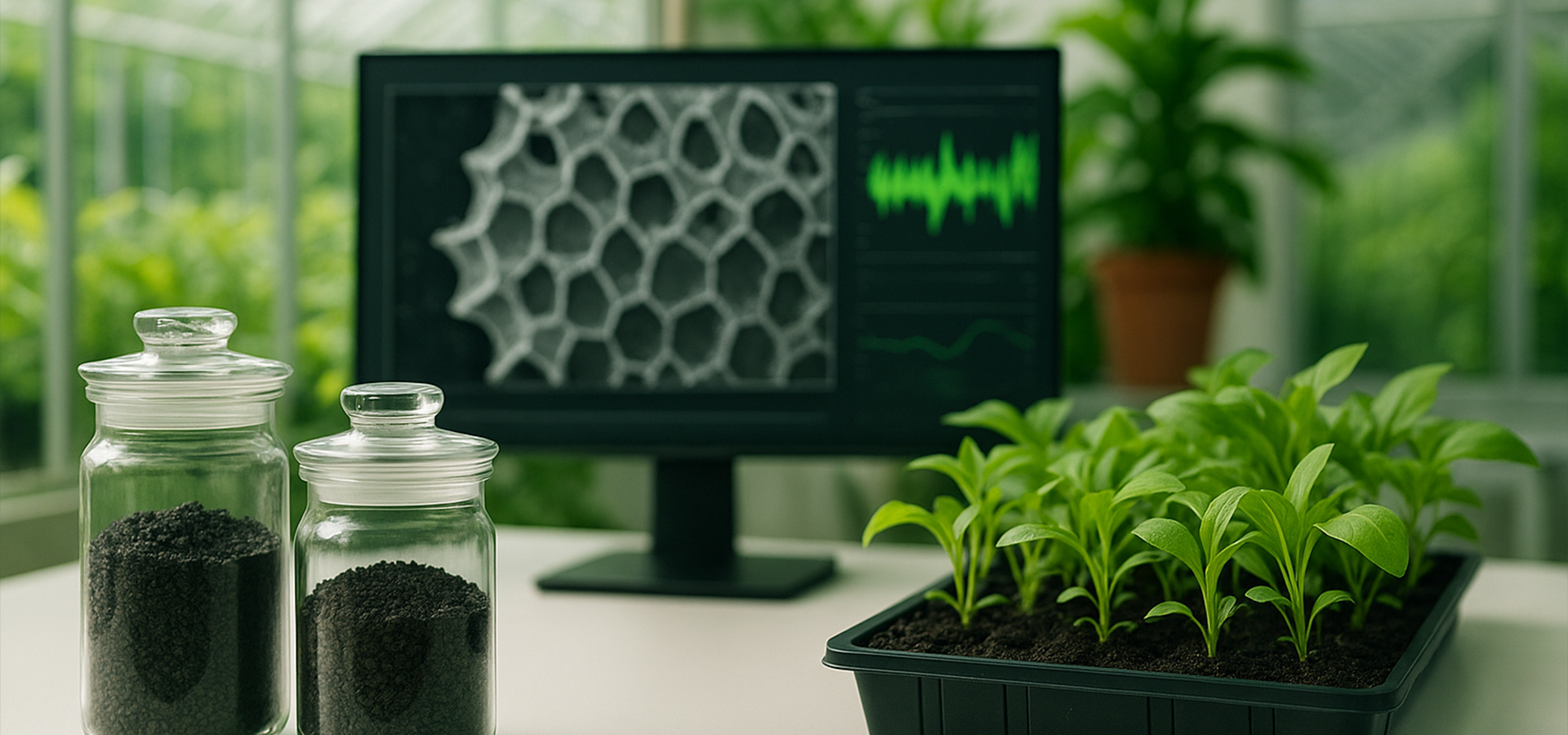 Nutrients dispersed throughout the carbon matrix attract microroots of new plants. As roots explore the matrix, they penetrate interconnected pores, accessing stored water and bio-available nutrients for vigorous early establishment.